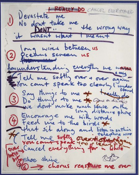 (b. 1947) English rock guitarist and bassist best known as a former member of The Jeff Beck Group, Faces, and current member of The Rolling Stones. Handwritten lyrics for a track from the album "Cancel Everything", which was originally titled "I Really Do", in red, purple, blue and brown marker. There is a trivial dampstain at bottom, otherwise, very good; the 7" x 9" sheet is matted with a color photo and descriptive plaque, framed to 22" x 19".