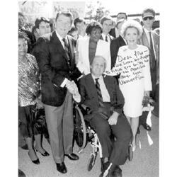 <b>303. RONALD REAGAN </b>Superb I.S.P., a photo signed as President, inscribed to the man who "took a bullet" for him, James Brady! The color photo measures 10" x 8" and shows Reagan on the White House lawn as he shakes hands with Brady, seated in a wheelchair beside a buffet table. Reagan boldly writes in the white bottom margin: <i>"Dear Jim - As always - it was great to have you (Y & H) on hand. Warmest Regards Ronald Reagan"</i>. Reagan had early on taken to calling Brady "Y and H", his abbreviation for "Young and Handsome". Very fine condition. <b>$5,000-7,000</b>