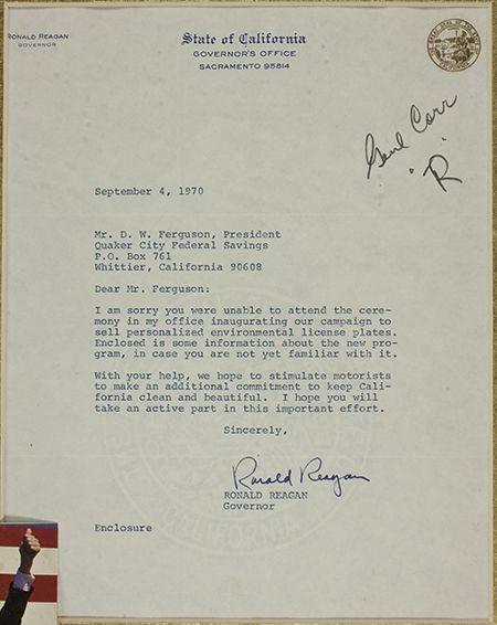 (1911 - 2004) Fortieth President of the United States who served for two terms (1981-1989) and contributed to the fall of European Communism. T.L.S. as Governor of California on official letterhead, 1p. 4to., Sacramento, Sept. 4, 1970, to D. W. Ferguson, President of the Quaker City Federal Savings Bank in Whittier, Ca. In part: "...I am sorry you were unable to attend the ceremony in my office inaugurating our campaign to sell personalized environmental license plates. Enclosed is some information...With your help, we hope to stimulate motorists to make an additional commitment to keep California clean and beautiful...". Simply framed. Pencil docket at top right, very good. Not examined out of frame.