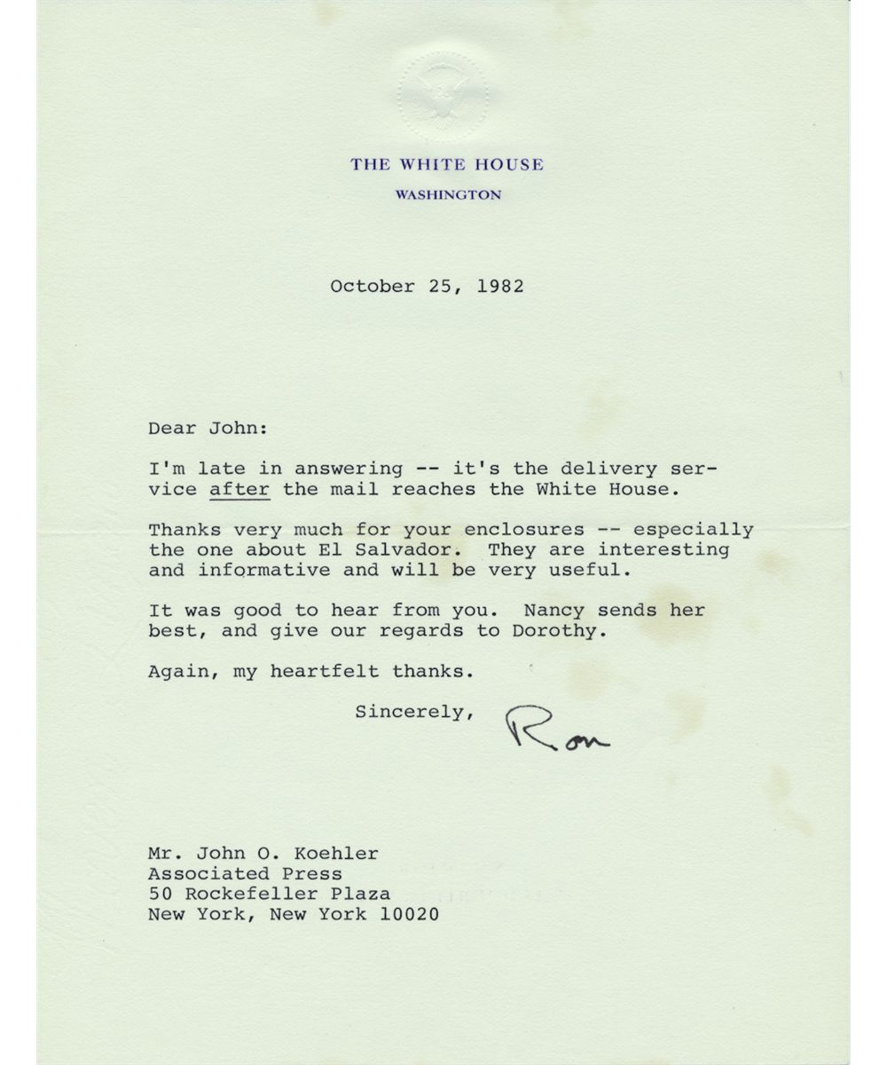 (1911 - 2004) Fortieth President of the United States who served for two terms (1981-1989) and contributed to the fall of European Communism. T.L.S. "Ron" as President on White House letterhead, 1p. 8vo., Washington, Oct. 25, 1982 to AP reporter, spy and intelligence expert John Koeller. In part: "...I'm late in answering -- it's the delivery service after the mail reaches the White House. Thanks very much for your enclosures -- especially the one about El Salvador. They are interesting and informative and will be very useful...". A few toned spots, else very good. Reagan was criticized for funding the Salvadoran Government which was in league with right wing "death squads".