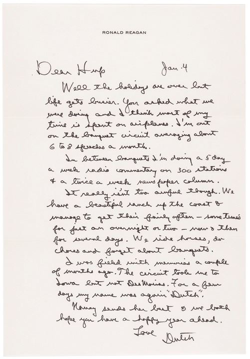 “Dear Hup / Well the holidays are over but life gets busier. You asked what we were doing and I think most of my time is spent on airplanes. I’m out on the banquet circuit averaging about 6 to 8 speeches a month. In between banquets I’m doing a 5 day a week commentary on 300 stations & a twice a week newspaper column. It really isn’t too awful though. We have a beautiful ranch up the coast & manage to get their (sic) fairly often - sometimes for just an overnight or two - now & then for several days, We ride horses, do chores and forget about banquets. I was filled with memories a couple of months ago. The circuit took me to Iowa but not Des Moines. For a few days my name was again “Dutch”. Nancy sends her best & we both hope you have a happy year Ahead. - Love - (Signed) Dutch”.