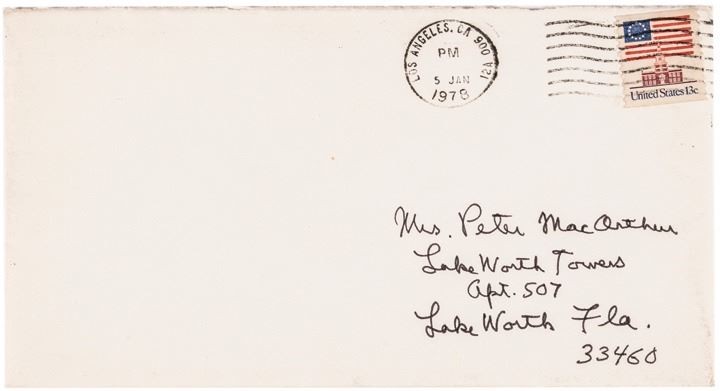 January 4 (1978)-Dated, Autograph Letter Signed, “Dutch”, 1 page, 7.25” x 10.5”, on “Ronald Reagan” personal stationery, Choice Extremely Fine. This bold and vividly written Letter in in deep black ink on a sheet of fresh bright stationary. Accompanied with the original transmittal envelope addressed to, “Mrs. Peter MacArthur, Lake Worth Towers, Apt. 507, Lake Worth, Fla. 33460”. Here Reagan writes, in full;