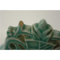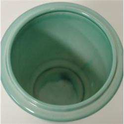 Rookwood covered vase with turquoise glaze. Has one small chip on top of lid. Marked on bottom with Rookwood symbol and 5477. 8.5" H to top of lid.