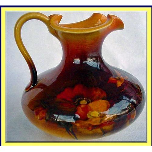 Very wide round, flattened shape, cylindrical neck flaring to a scalloped, wide rim. Simple question mark handle. Ground colours of body range from golden light and honey yellow through earthy orange tones to beautiful rich browns. The ewer is superbly handpainted in enamels by Constance Baker. Poppies - in full bloom and in bud and delicate stems and foliage. Colours are reds and yellows to greens. Fine detail.