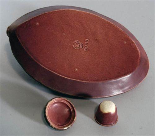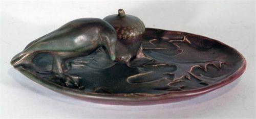 ROOKWOOD RAVEN INK STAND with Rookwood mark and dated 1914, form #2012, 9 1/2" long, with original pottery ink liner, CONDITION: some small chips to bottom of ink pot lid. PACKING AND SHIPPING BY FAIRFIELD AUCTION WITHIN CONTINENTAL USA (excluding insurance) $25,