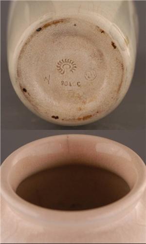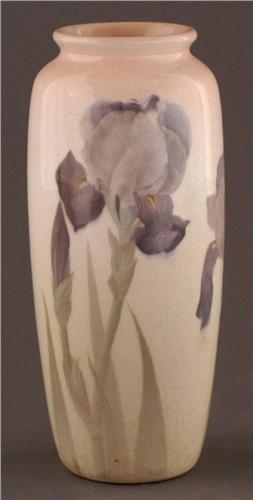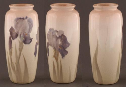 ROOKWOOD VASE decorated by Carl Schmidt 9 3/4" high vellum glaze with irises dated 1904 <BR>condition: 5" old tight hairline to back side, 1” old tight hairline at rim