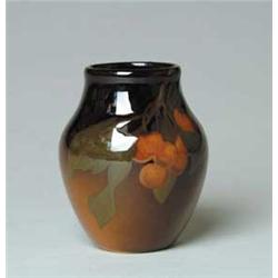 Lot 1352 ROOKWOOD VASE. Beautiful Rookwood vase is decorated with green leaves and cherries extending down from lip against a dark brown to green background. Iris glaze. Marked on bottom with Rookwood flame mark and "IV" plus "914F" and artist initials "EN". Also marked with an "X" etched through glaze on bottom. SIZE: 4-3/4" t. CONDITION: Roughness to glaze on tree branch near lip, appears to be flaw in manufacture, otherwise very good. 5-70134 (250-350)
