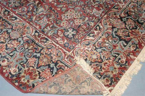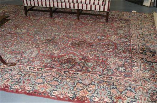 ROOMSIZE SAROUK CARPET 10'4"x13'6", circa 1940, CONDITION: minor stains and wear, replaced fringe.
