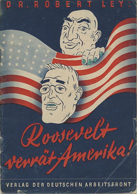 ROBERT LEY (1890-1945) Nazi politician, virulent anti-Semite, and head of the German Labor Front. Ley ruthlessly enforced slave labor policies, and committed suicide in his jail cell at Nuremburg while awaiting trial. The booklet, Roosevelt Betrays America! is written by Ley and published by the German Labor Front, 30pp., 8vo. It bears a cover illustration of Franklin D. Roosevelt with an American flag behind him, the flag being drawn downwards by a caricature of a Jew. Within, almost every "negative" aspect of American society as perceived by the Nazis is laid at Roosevelt's feet, with the knowing complicity of Jews. F.D.R. is shown with LaGuardia, Henry Morgenthau, and a group of Shriners, Eleanor oosevelt is shown with two black soldiers, several caricatures depict Jews, and Roosevelt is blamed for everything from the Depression and gangsterism to a woman being crowned a "Turkey Queen". Very good.