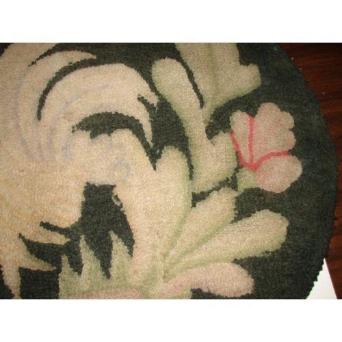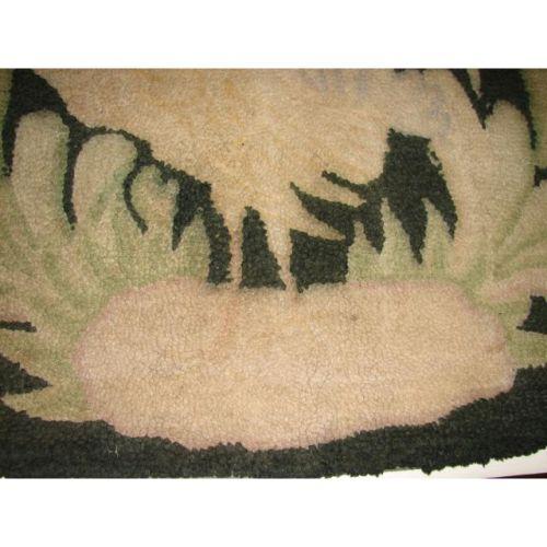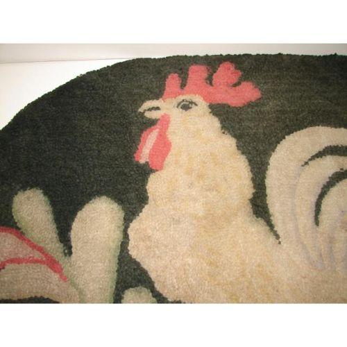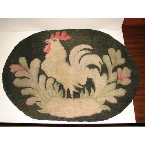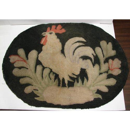 PRIMITIVE ROOSTER DECORATED HOOKED RUG. Decorated with standing rooster & two flowers on a black background. 37.25” x 26.75”