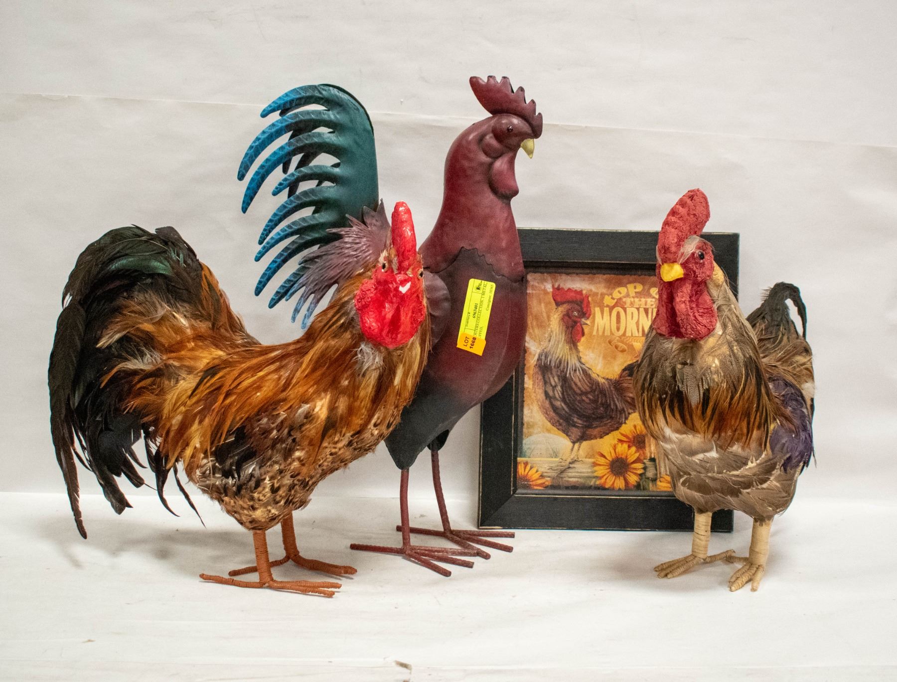 ROOSTERS COLLECTION. 1 METAL, 2 STUFFED,
