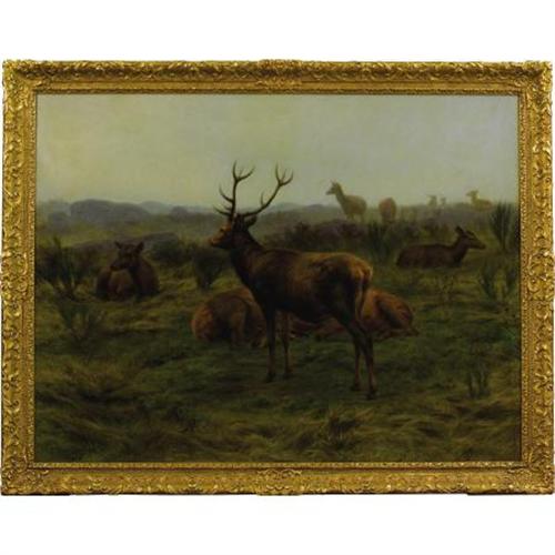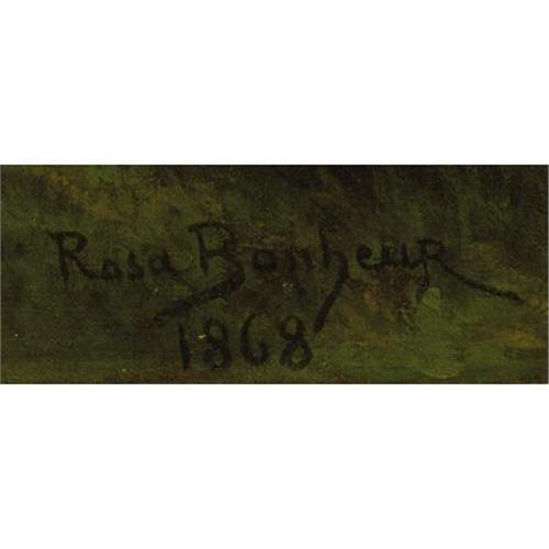 <B>ROSA BONHEUR</B></I> (French 1822-1899)<BR><I>The Monarch of the Herd</B></I>, 1868<BR>Oil on canvas<BR>31-1/4 x 39 inches (79.4 x 99.1 cm)<BR>Signed and dated lower left: Rosa Bonheur / 1868<BR> <BR>Provenance:<BR>Geraldine Rockefeller Dodge<BR><BR>Rosa Bonheur was born into a family of artists and progressive thinkers. Her father was a believer in Saint-Simonianism, a Christian-socialist sect that promoted the education of women alongside men. In spite of her difficulties with formal education, Rosa was taught to read by her mother by drawing animal illustrations for the alphabet. She was disruptive in the classroom and was expelled from numerous schools. Her father agreed to train her as an artist. She copied images of animals from books, models, and from the animals in the rural areas close by Paris. She studied animal anatomy and osteology by visiting the slaughterhouses and by dissecting animals. Her paintings of animals met with great acclaim due to their realistic portrayals. Bonheur became famous as an animalière and realist artist, even while the actual scenes of wildlife were rapidly disappearing due to the increasing industrialization of Europe.<BR><BR><b>Shipping:</b> Requires 3rd Party Shipping (<a target="_blank" href="http://www.heritageauctions.com/common/shipping.php">view shipping information</a>)