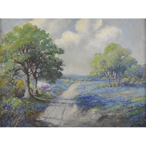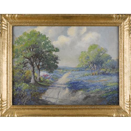 <B>ROSE DRIVER (1896-1985)</B></I><BR>Untitled Bluebonnet Landscape<BR>Oil on canvas<BR>18in. x 24in.<BR>Signed verso<BR><BR>Rose Driver studied art and interior design at Ward Belmont College. In the early 1940s, she opened a shop in Dallas called Rose Driver Antiques. Among her notable art achievements were inclusion in the Texas Centennial, Texas General Exhibition, Southern States Art League, and the Dallas Allied Arts Exhibition.<BR><BR> <B>Condition Report:</B> Good condition. Original canvas with no lining. Some strengthening of the sky above the path. Period frame in excellent condition.<BR><BR><b>Shipping:</b> Requires 3rd Party Shipping (<a target="_blank" href="http://www.heritageauctions.com/common/shipping.php">view shipping information</a>)