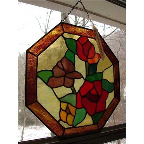 <tr><td>Title:ROSE FLORAL GARDEN SMALL STAINED GLASS WINDOW</td></tr>