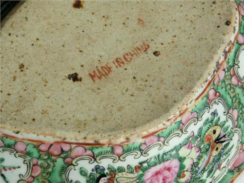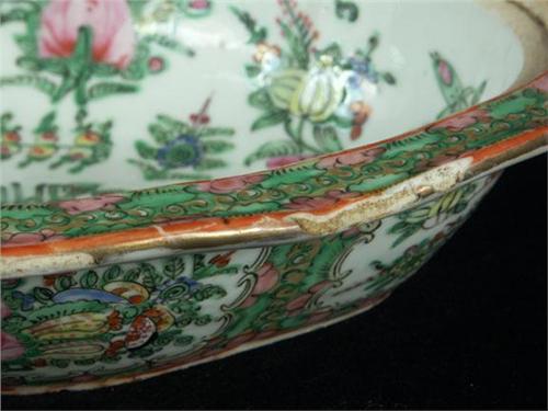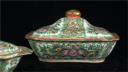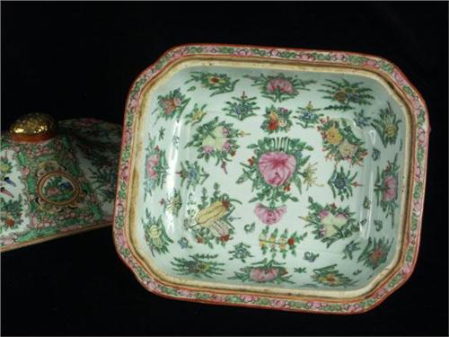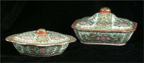 PORCELAIN: Two Rose Medallion Chinese Export porcelain tureens with lids purchased in Shanghai in 1929. The first has a flora, bird and butterfly motif and measures 10''L x 9''W x 6 1/4''H with finial on lid. The interior is also decorated with a flora motif, ''Made in China'' marked on glazed underside. No chips or cracks noted, some wear to gilding on the finial. The second tureen is oblong in form and is also decorated inside and out with a flora and fauna motif, marked ''Made in China'' on unglazed underside. It measures 9''L x 8''W x 4 3/4''H with much of the rim deteriorated with large shallow chips.