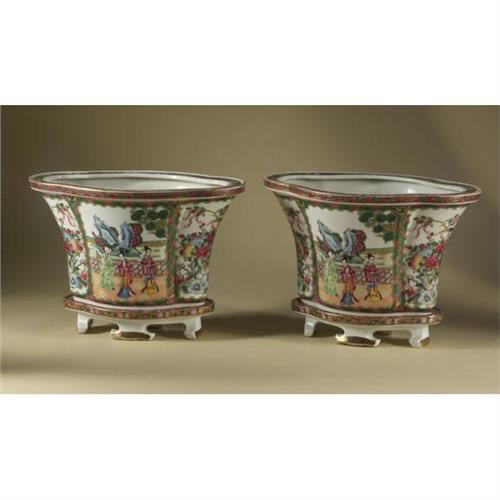PORCELAIN: A pair of Chinese porcelain planters and bases, Rose Medallion, polychrome figural and floral reserves, planter measures 8'' x 13.5'' x 8.5'', base measures 2'' x 9.5'' x 6'', no chips or cracks noted.