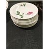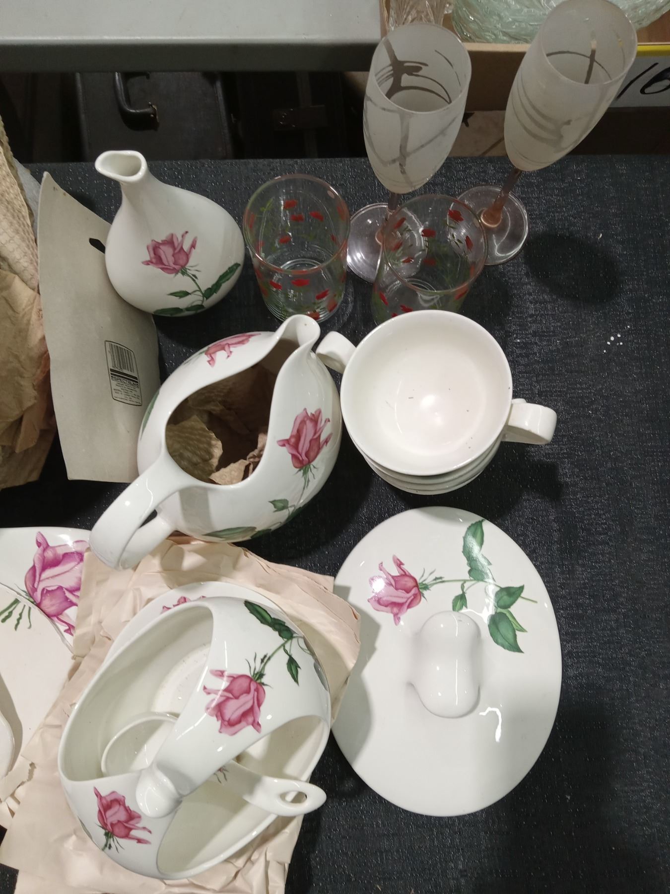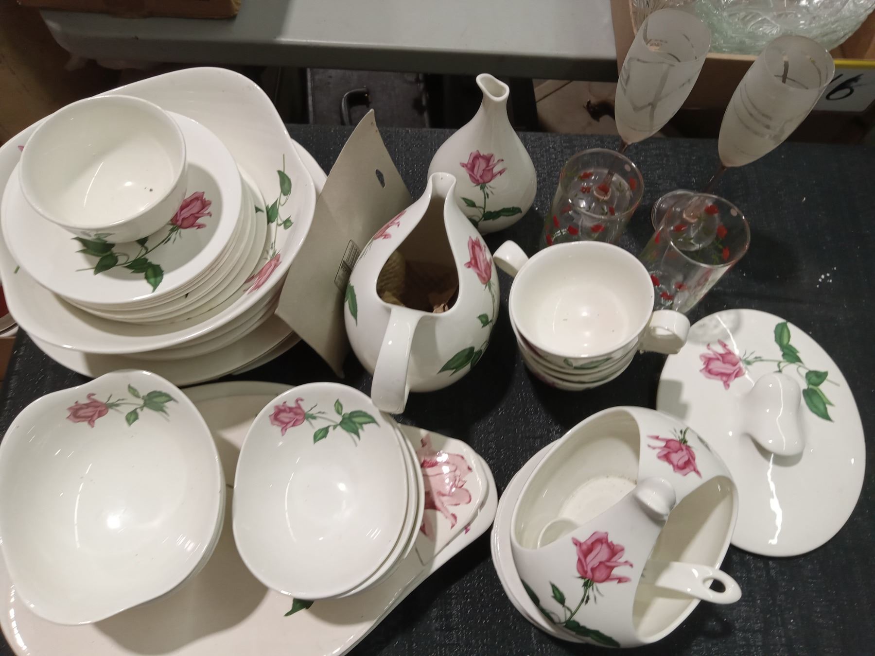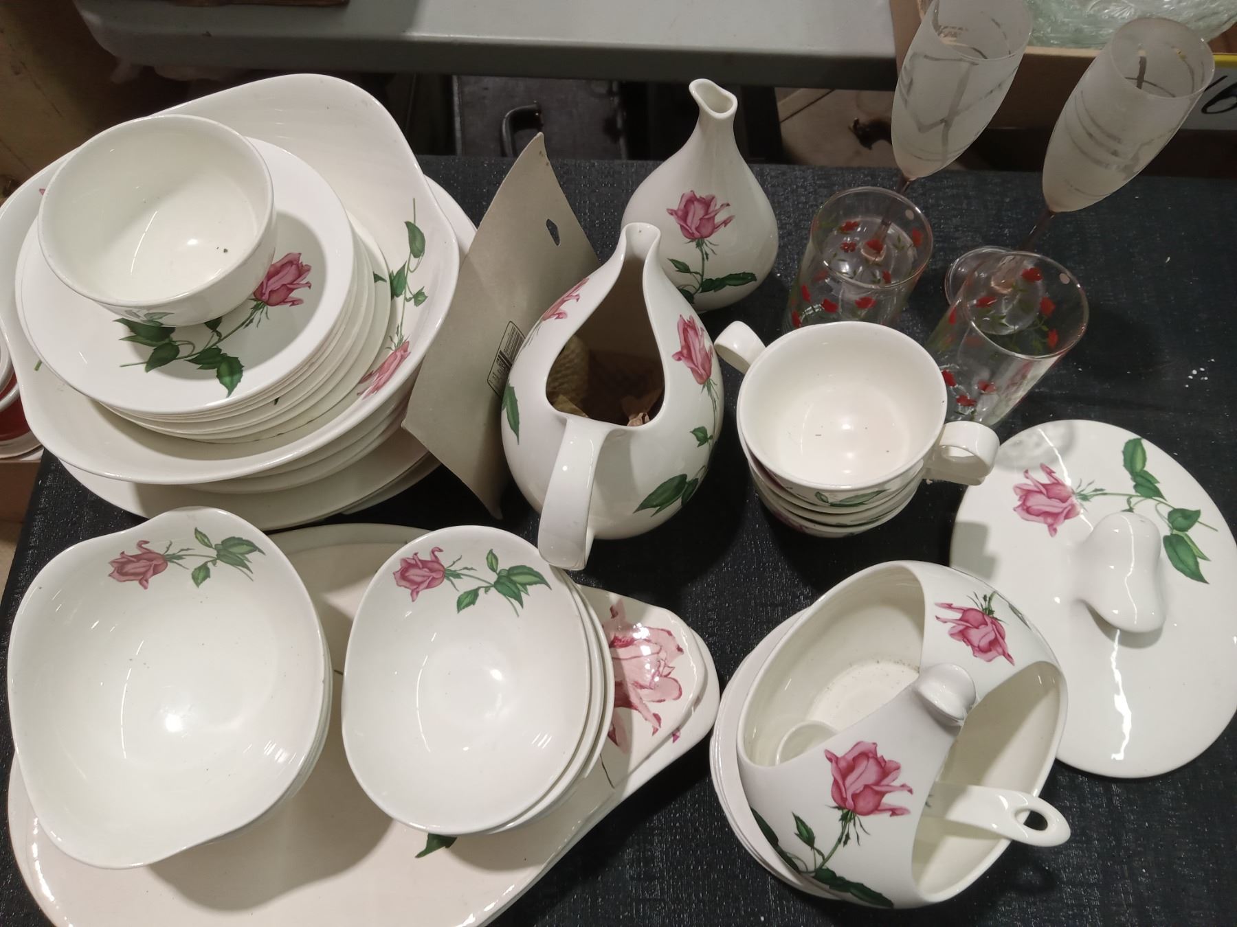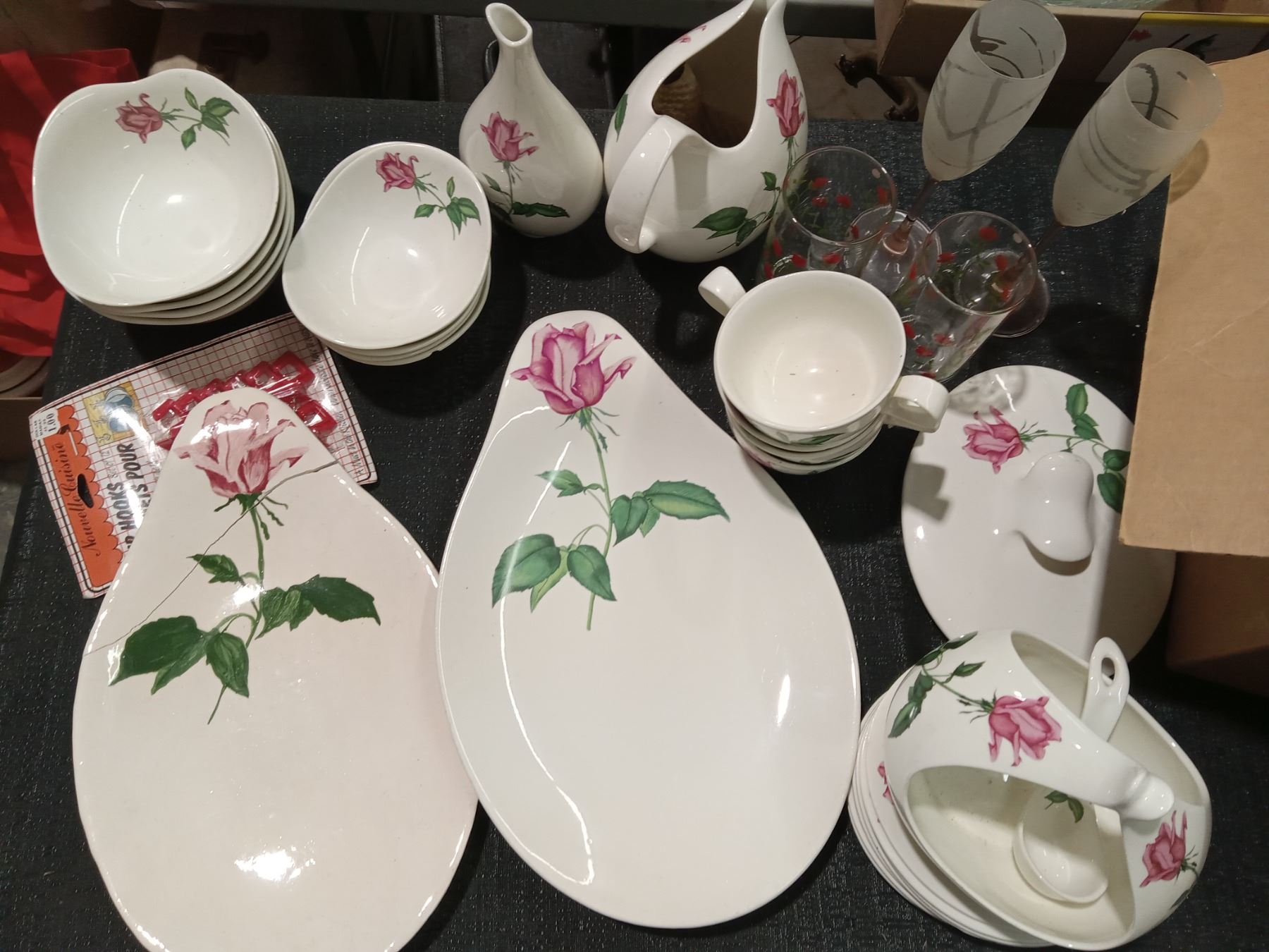 ROSE PATTERNED DISHES, GLASSES, SERVING SET & CHAMPAGNE FLUTES
