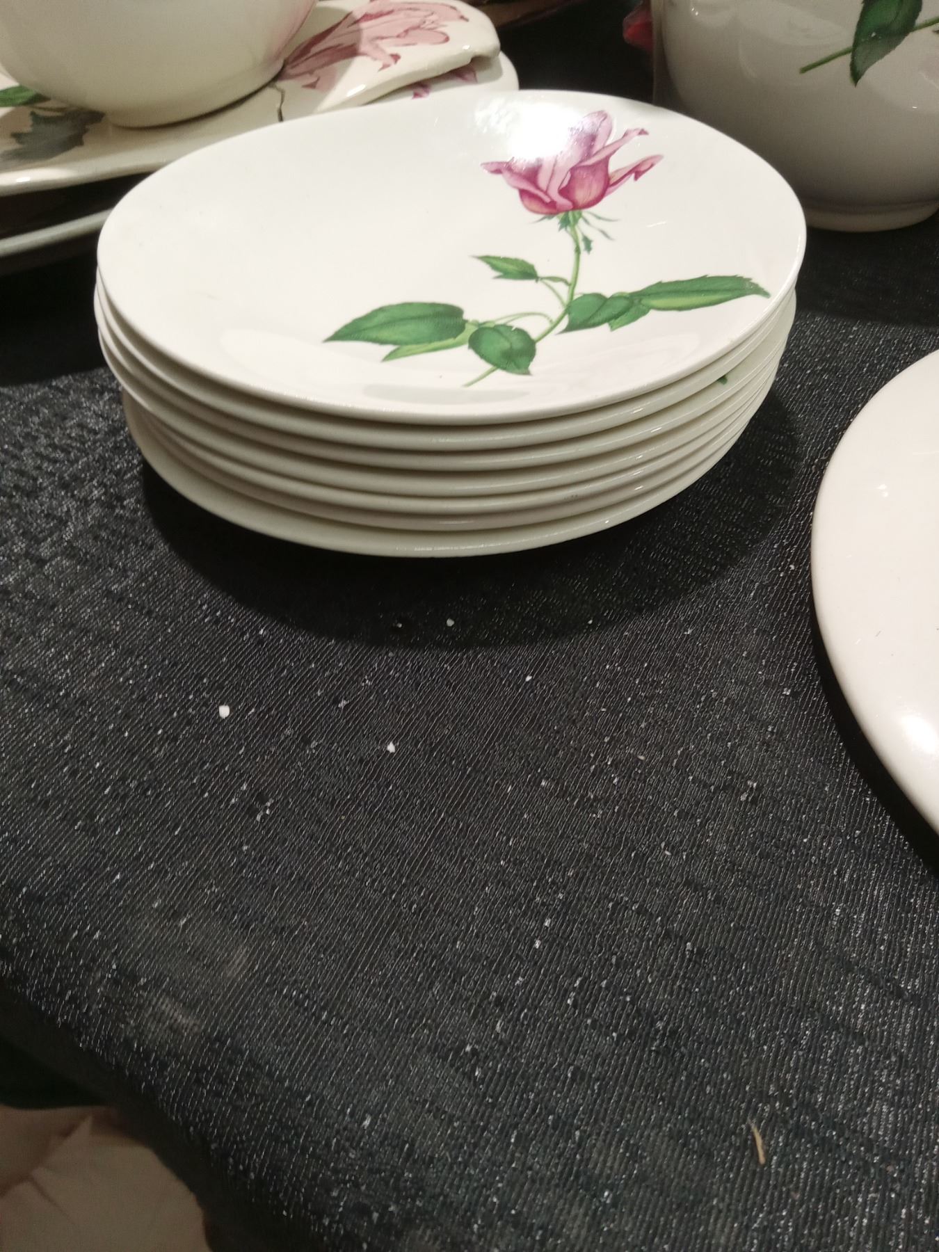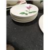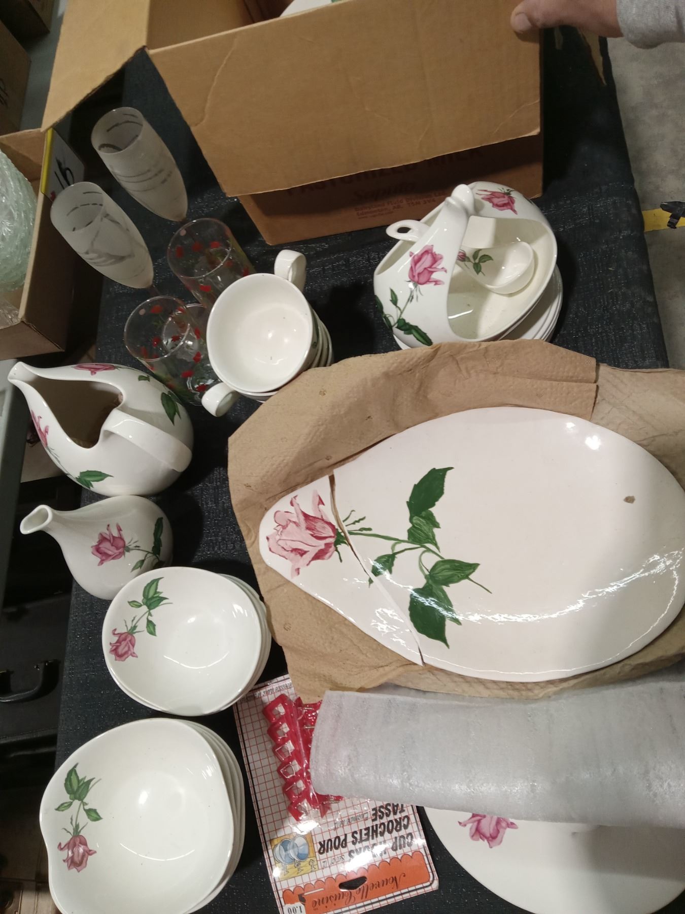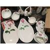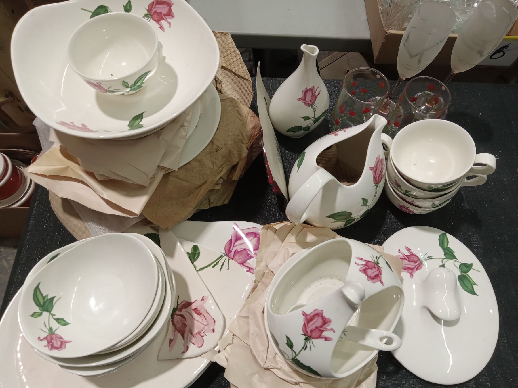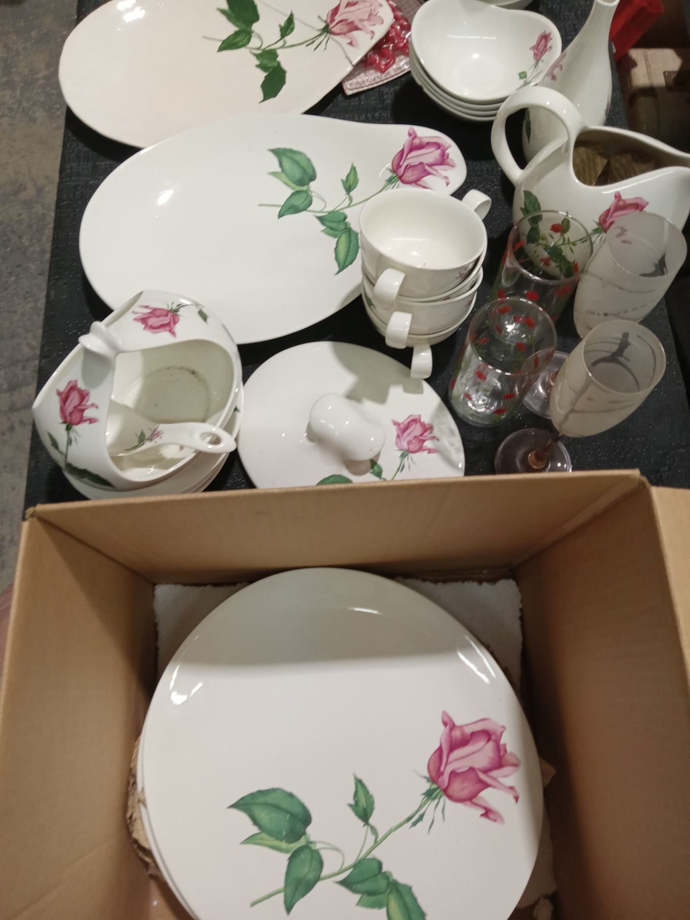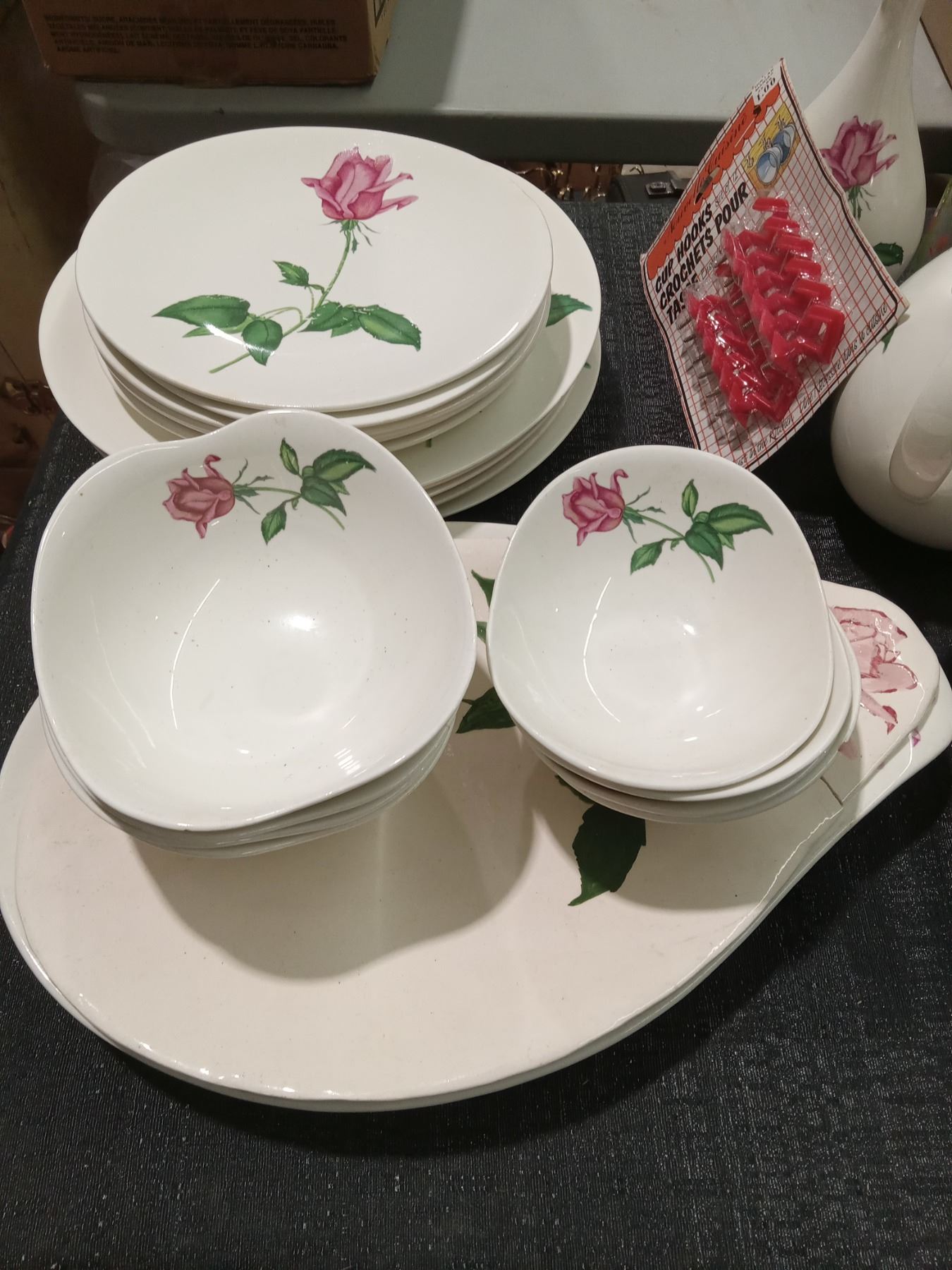ROSE PATTERNED DISHES, GLASSES, SERVING SET & CHAMPAGNE FLUTES