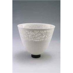 ROSENTHAL, KUNSTABT. SELB, Selb Alan Whittaker Objekt Tissu, Porzellan, Holz. Weiß. Auf loser, schwarzgebeizter Holzscheibe eine Schale in Kelchform. Die Wandung ist im oberen Drittel filigran durchbrochen. H.: 16 cm (mit Fußscheibe). Mod.Nr. 3512. In originalem Holzetui. Bez.: Alan Whittaker (Signatur) Alan Whittaker 500/140 Rosenthal Limitierte Kunstreihen. 1980 Lit.: Rosenthal 100 Jahre Porzellan, Ausst.kat. Kestnermuseum Hannover, Stuttgart 1982, Abb. 109, S. 123.
