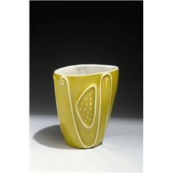 Porzellan. Limonengrüne Aufglasurbemalung. Amorphe Becherform; auf der Wandung umlaufendes reliefiertes Linien- und Punktdekor. H.: 9,5 cm. Bez.: Firmenmarke (unterglasurgrüner Stempel). Ende der 1950er Jahre