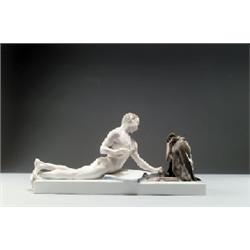 Porzellan. Farbige Bemalung in mehrtonigem Grau und Blau. Auf einem rechteckigem Sockel liegender männlicher gestikulierender Akt über ein Buch gebeugt, vor ihm hockend ein Marabu. H.: 17,4 cm, L.: 39 cm (In dieser Größe wurden nur 200 Exemplare hergestellt). Bez.: Firmenmarke (aufglasurgrüner Stempel), Mod.Nr. K35,auf der Plinthe Künstlerrname FERD. LIEBERMANN. Um 1911