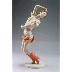 ROSENTHAL, KUNSTABT. SELB, Selb Lore Friedrich-Gronau Figur Csárdás, Porzellan. Farbige Bemalung. Auf einem runden Sockel mit schwachen Einschwüngen eine Tänzerin in bewegter Csárdás-Pose. Dargestellt von der Charaktertänzerin Ursula Deinert. H.: 34,5 cm. Bez.: Auf dem Sockel Künstlersign. L.FRIEDRICH-GRONAU, Firmenmarke (ugl.-grüner Stempel, Mod.Nr. 1714. 1949 Lit.: Niecol, Emmy, Rosenthal Kunst- und Zierporzellan 1897-1945, Bd. II, Wolznach 2001, S. 106, Nr. 3.0185.