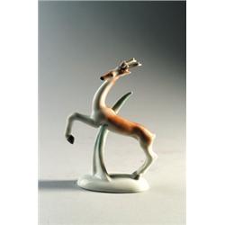 Porzellan. Farbige Aufglasurbemalung. Springender Rehbock mit nach links gewandtem Kopf. 11,5 x 8,5 x 3,2 cm. Bez.: Firmenmarke (unterglasurgrüner Stempel), Künstlermarke L. OTTO, Mod.Nr. 267 (Pressmarken). Um 1927