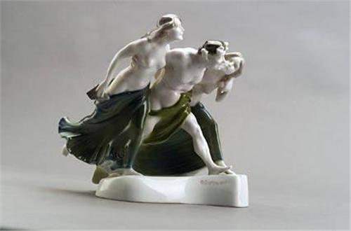 A. Caasmann<BR> Figur Stürmende Bacchanten,<BR> Porzellan. Farbige Unterglasurbemalung. Bacchant, zwei Bacchantinnen umfassend, auf anorganischem Sockel mit gebeugten Oberkörpern vorwärts stürmend. Ein Fuß rest.. H.: 21 cm. Bez.: Firmenmarke (ugl.-grüner Stempel), Mod.Nr. K190, auf der Plinthe a. Caasmann. (Blindstempel, ugl.-rot bemalt). Um 1914<BR> Lit.: Rosenthal 100 Jahre Porzellan, Ausst.kat. Kestnermuseum Hannover, Stuttgart 1982, Abb. S. 39, Nr. 80<BR>