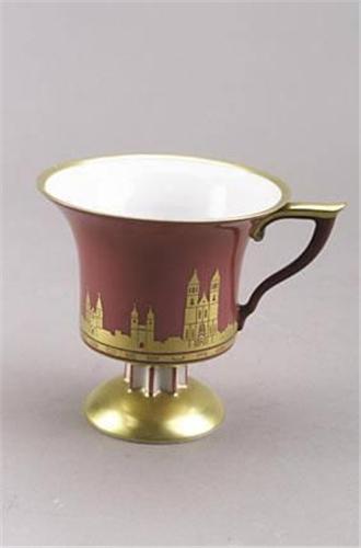 Albin Müller<BR> Tasse,<BR> Porzellan. Farbige Bemalung mit Goldstaffage der Stadtansicht von Magdeburg. Min. best. 9,6 cm. Bez.: Künstlerinitialen AM, Firmenmarke (ugl.- grün), in der Goldbemalung :DAS SCHÖNE MADGEBURG. 1927<BR>