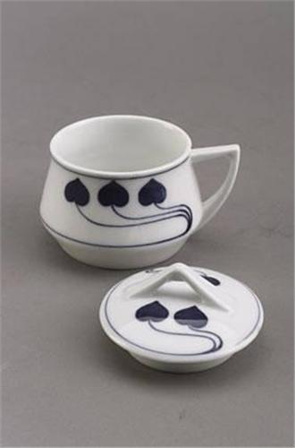 Vereinigte Kunstgewerbler Darmstadt<BR> Tasse,<BR> Porzellan. Dekor Stehende Herzen, aus dem Service Botticelli/Darmstadt. Tasse best. Beiliegend ein Zuckerdosendeckel, best. H.: 5,8 und 4,3 cm. Bez.: Firmenmarke (ugl.-grüner Stempel). Um 1905<BR>
