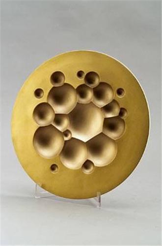 Tapio Wirkkala<BR> Jahresteller,<BR> Porzellan. Goldfarbene Bemalung. Flacher runder Teller mit seifenblasenartigen Vertiefungen, gesamte Oberfläche in Gold bemalt. Im Originaletui. Ø 31 cm. Bez.: Firmenmarke (ugl.-grüner Stempel), Malermarke, goldener Aufglasurstempel mit Seriennummer Rosenthal Jahresteller Edition 1971 Design: Tapio Wirkkala 2764/3000. 1971<BR> Lit.: Struss, D., Rosenthal, Augsburg 1995, S. 120.<BR>