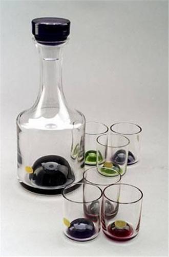 Tapio Wirkkala<BR> Likörservice,<BR> farbloses Glas mit violetten, grünen und roten Innenüberfängen. 7-tlg., bestehend aus 6 Gläsern und einer Karaffe. Über farbig überfangenen gewölbten Böden zylindrische Gläser, ebenso die Karaffe. H.: Glas: 6,2 cm, Karaffe 42,6 cm. Bez.: Künstlersign. T WIRKKALA, Firmenmarke (Ätzstempel), Firmenklebeetikett. 1970er Jahre<BR>