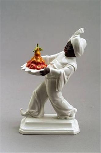 Hugo Meisel<BR> Mohr,<BR> Porzellan. Farbige Bemalung. Auf rechteckigem Sockel schreitender Mohr der ein Früchtetablett trägt. H.: 17 cm. Bez.: Firmenmarke (ugl.-grün, Künstlersign. H.MEISEL, Mod.Nr.: 863P. 1949<BR>