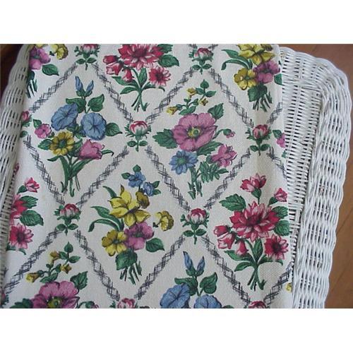 Shabby Chic ROSES and flowers bouquets barkcloth fabric panel. This most pretty vintage cheerful floral barkcloth is in excellent condition dating from the 1940s-50s. It measures about 44 inches by 43 inches. Lovely to make totes,cushions, valance curtains etc Would be SO pretty on an antique wicker chairs! The colors are beautiful with lush roses and flowers all on a creamy white nubby background! See the other shabby chic romantic cottage textiles we have listed. If you enjoy collecting antique and vintage lace and linens, barkcloth, all things roses, Shabby Chic, Romantic Cottage and Paris Apartment décor , you may wish to bookmark us since we list often. Thanks and enjoy your day!