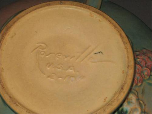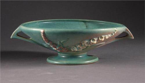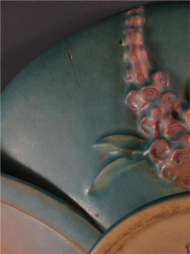 Roseville green foxglove pattern console bowl (2-10''); note sizable older crack that nearly joins. Excellent restoration project.