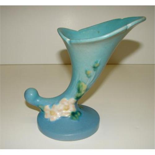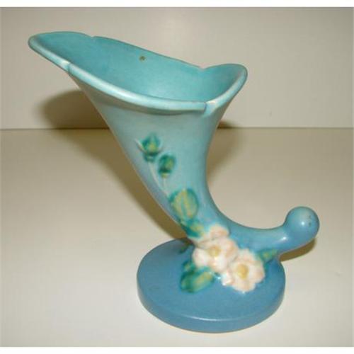 ROSEVILLE BLUE WHITE ROSE CORNUCOPIA 143-6”. Excellent condition. Marked on bottom.