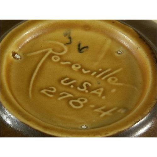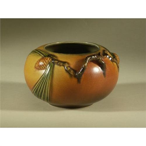 POTTERY: Roseville squat bulbous brown ''Pinecone'' rose bowl, molded raised-relief hallmark, shape number 278, size 4'', minute glaze ''pock'' noted, 1936-1939.