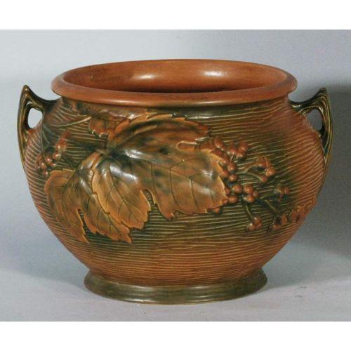 ROSEVILLE BUSHBERRY 10" jardinaire and pedestal, early 20th century, ONLY JARDINAIRE IS SHOWN, YOU ARE BIDDING ON JARDINAIRE AND ORIGINAL MATCHING PEDESTAL, CONDITION REPORT: no damage, Subject to our Terms and Conditions, PACKING/SHIPPING within continental U.S. excluding insurance (which is required) will be handled by Fairfield Auction for $50,