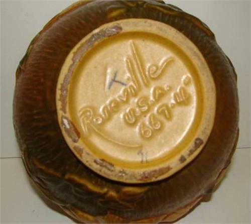 ROSEVILLE CLEMATIS, 1944 VASE. Double handles. Marked on bottom “Roseville/U.S.A./667-4”. 4” H