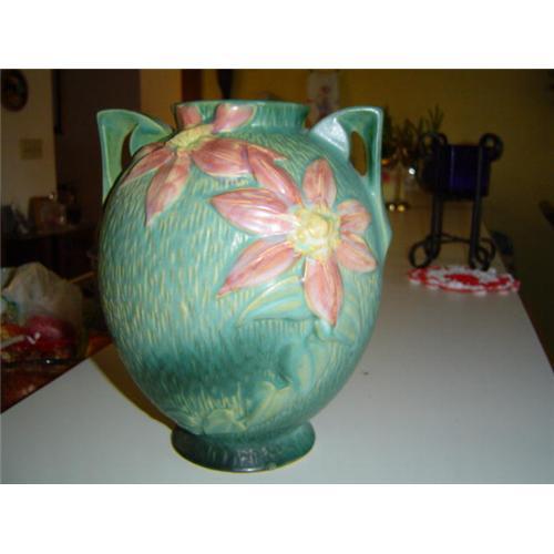 Roseville Pottery Clematis two handled large vase # 107-86". C. 1944. Has the Roseville Pottery makers mark and black H under the glaze. It has a small glaze flaw at the bottom foot caused by another piece placed against it while firing. NO other cracks, nics, only faint crazing on the bottom of the piece. It is that beautiful green and pink color that is so desirable.