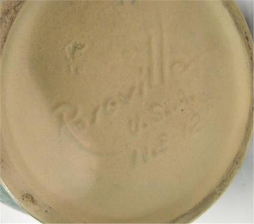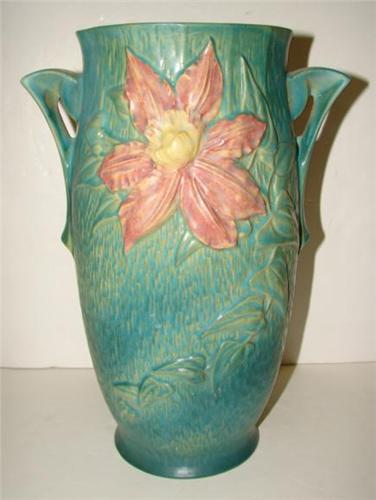 ROSEVILLE POTTERY CLEMATIS VASE. Double handles. Marked on bottom “Roseville/U.S.A./112-12”. Shows one small chip at edge of base. 12.25” H