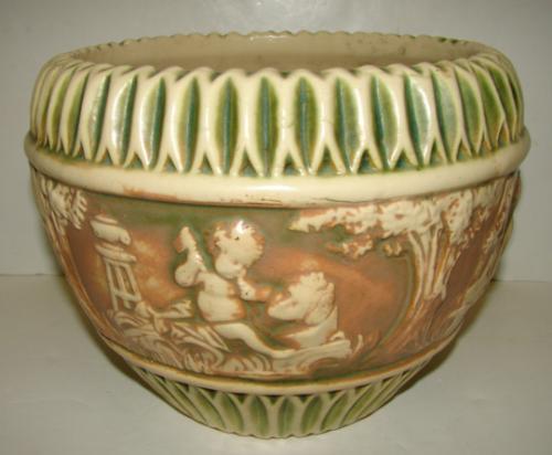 ROSEVILLE POTTERY DONATELLO JARDINIERE. Shows crazing to interior. Marked on bottom with blue “RV” mark. 7.5” H