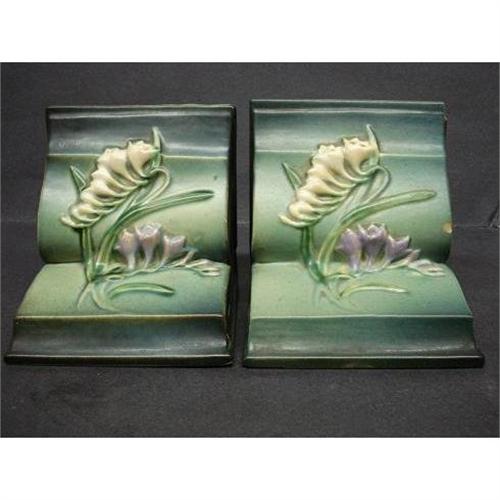 LOVELY PAIR OF ROSEVILLE BOOK ENDS, VERY HEAVY - GORGEOUS, SHADES OF GREEN BACKGROUND COLOR DEPICTING OFF WHITE AND LAVANDER FREESIA BLOSSOMS - as per pictures - EACH PIECE SIGNED: ROSEVILLE U.S.A. EARLY MAKE #15,- excellent condition but for acouple of tiny chips - right hand edge - on one of the book ends, Each measures about 5 1/4" x 5 1/4" wide x 4 3/4" deep - BEAUTIFUL PAIR AND QUITE RARE TO FIND - US Buyer to pay 15.00 (heavy) plus insurance - THANKS.