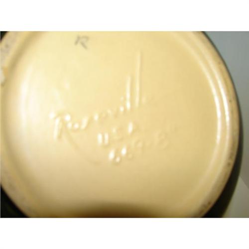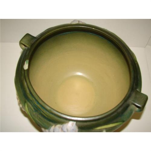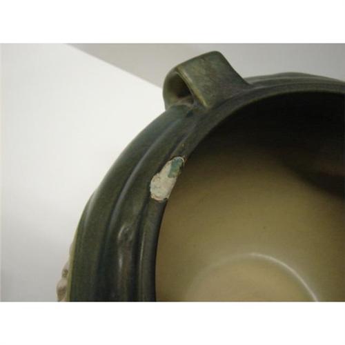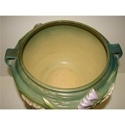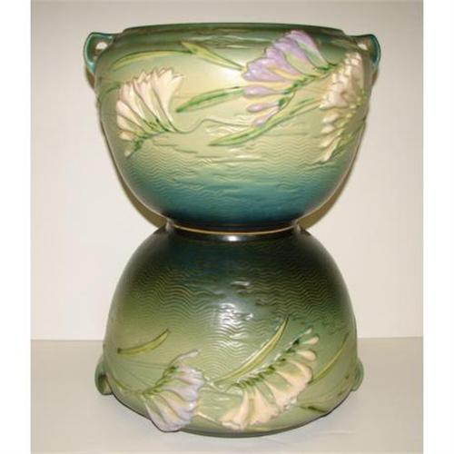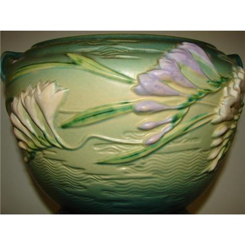 PAIR ROSEVILLE GREEN FREESIA JARDINIERES 669-8”. One in very good condition with some minor scratches to the interior only. The other with a large chip and one small glaze skip, both to rim.