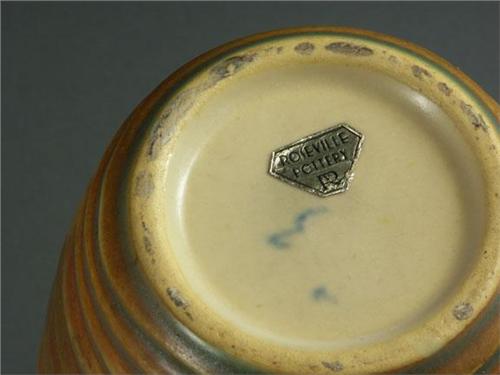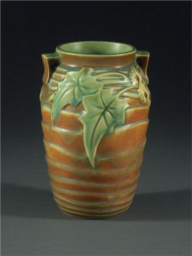 POTTERY: A Roseville pottery brown ''Luffa'' pattern vase, a tropical flower against a ribbed, beehive style ridged ground, 7'' H, shape number 685, original sticker on bottom to read Roseville Pottery in black writing on gold, no chips or cracks noted, some slight glazing flaws noted.