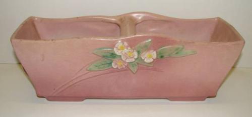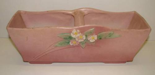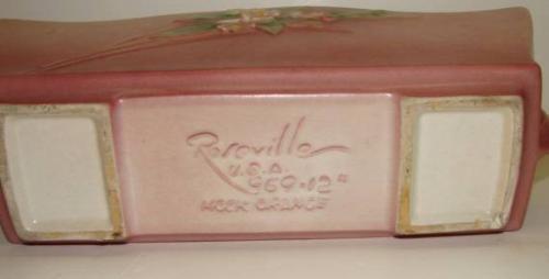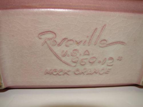 ROSEVILLE MOCK ORANGE, 1950 PLANTER. Double handles. Shows crazing throughout. Marked on bottom “Roseville/U.S.A./969-12”. 4.5” H
