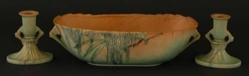 title should read, ROSEVILLE "MOSS" PATTERN CONSOLE BOWL #294-12 AND CANDLESTICKS #1107-4, fleck to rim of bowl<BR><BR><BR>Packing and Shipping: $40