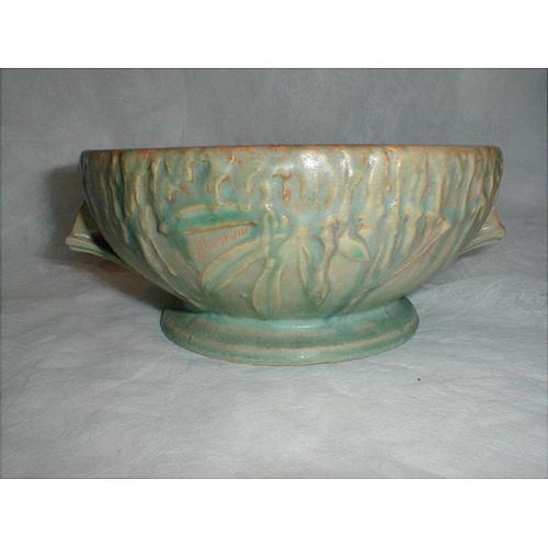 HERE IS A LOVELY BOWL BY ROSEVILLE IN THE MOSS PATTERN THAT WAS PRODUCED IN JULY OF 1936. THIS PATTERN DEPICTS AN EMBOSSED SPANISH MOSS HANGING IN CLUSTERS IN VERTICAL LINES FROM BROWN BRANCHES WITH GREEN LEAVES. THIS BOWL IS SIGNED, ROSEVILLE, NO. 291-6 AND MEASURES 3 IN. TALL AND 6 IN. IN DIAMETER AND IS IN VERY GOOD CONDITION WITH NO CHIPS, CRACKS, OR REPAIRS.