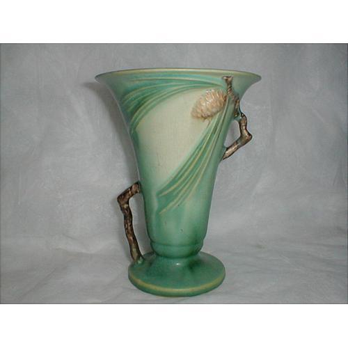 THIS VASE IS BY ROSEVILLE IN THE PINECONE PATTERN AND IS BELIEVEE TO BE THE SAVIOR OF THE COMPANY IN THE 30'S AS WITHOUT IT, ROSEVILLE WOULD HAVE CLOSED ITS DOORS. THIS VASE MEASURES 6 IN. TALL AND 5 IN. IN DIAMETER AND IS IN VERY GOOD CONDITION WITH NO CHIPS, CRACKS, HAIRLINES, OR REPAIRS. THIS DESIGN IS REALISTIC WITH HANDLES IN THE FORM OF BRANCHES JOINED TO A PINECONE. EACH PINECONE IS EMBOSSED AND DECORATED BY HAND AND THEN DIPPED IN A MATT GLAZE.