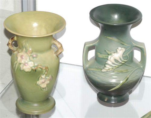 ROSEVILLE POTTERY (2), vase 385-8 and vase 122-8, condition: minor rubs to 122-8 on handles, packing and shipping w/i continental USA $40 + insurance